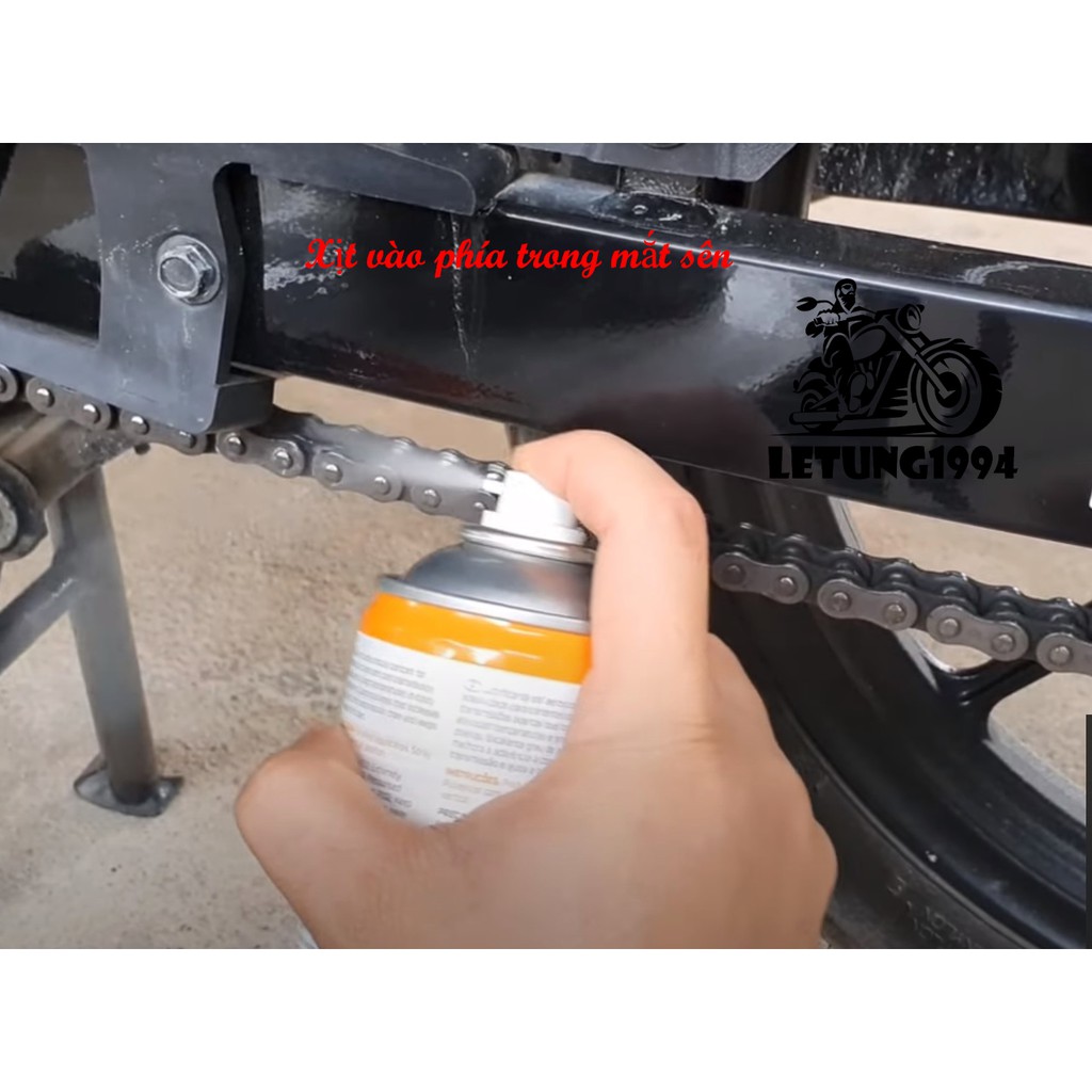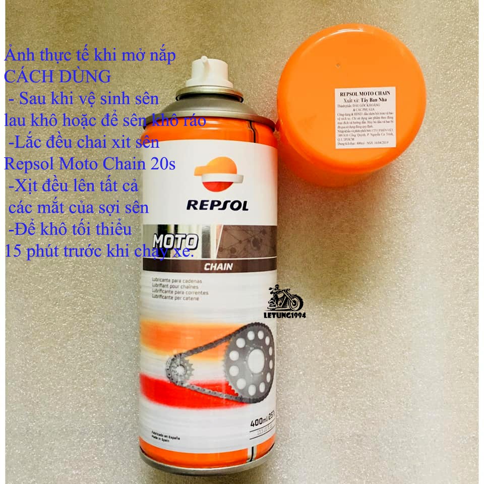 - Chai xịt sên/xích Repsol Moto Lube Chain mang lại sự bảo vệ và vận hành tối ưu, giúp kéo dài tuổi thọ cho sên xe của bạn. Sản phẩm giúp giảm tiếng ồn, giúp sên trần khó bị bám bụi, bảo vệ ron cao su trong mắt sên/xích.
