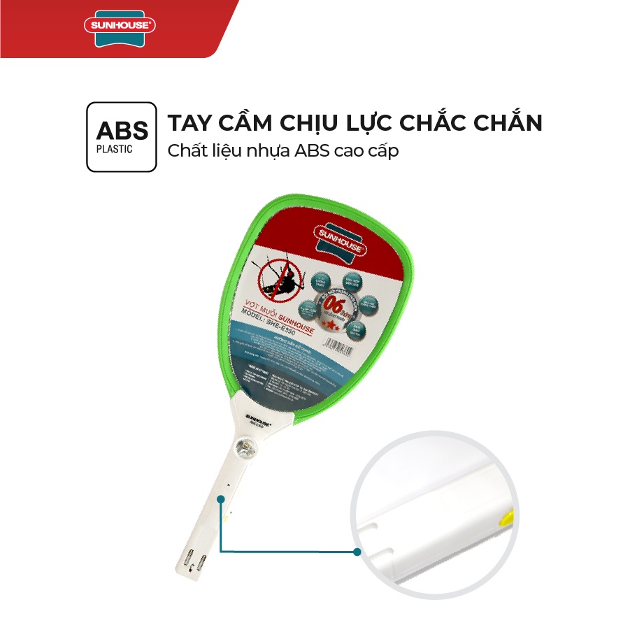 Vợt muỗi SUNHOUSE SHE-E350 có tay cầm bằng nhựa, chống trượt hiệu quả nên người dùng cầm nắm vợt ổn định, vững chắc, độ dài tay cầm phù hợp nên rất thoải mái sử dụng tại gia đình.