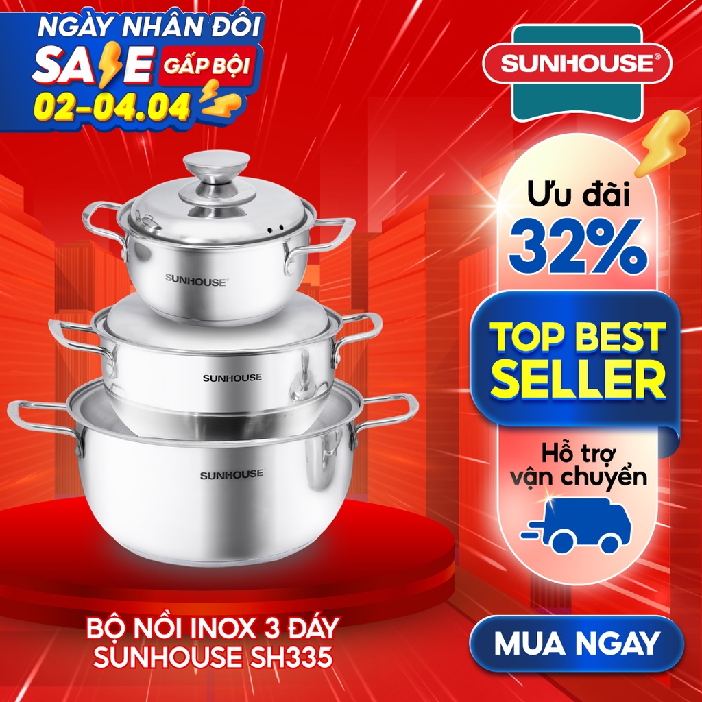 Nhà cửa & Đời sống > Dụng cụ nhà bếp > Nồi || [Mã LIFEHL44 giảm 15% đơn199K] Bộ Nồi Inox 3 Đáy SUNHOUSE SH335 16, 20, 24 cmCòn hàng