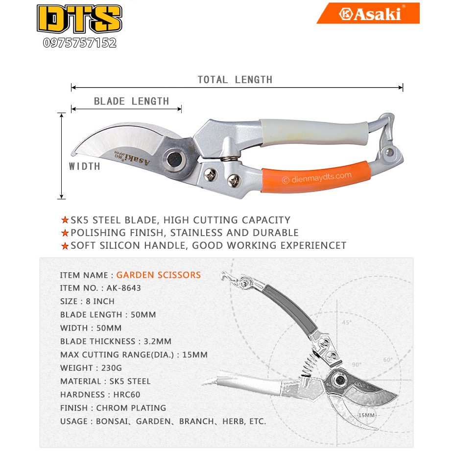 Giới thiệu Kéo cắt cành lưỡi inox Asaki Nhật AK-8643 8inch/200mm - Kéo cắt cành thép Nhật