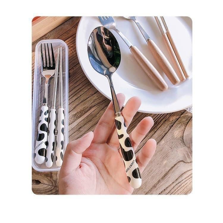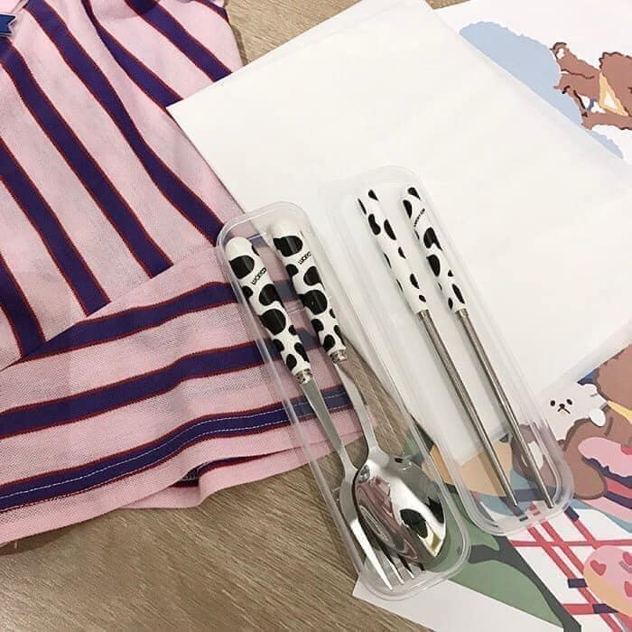 [Mã LIFEHLSALE2 giảm 10% đơn 0Đ] Bộ thìa đũa văn phòng inox cán sứ cao cấp bò sữa có hộp đựng A048