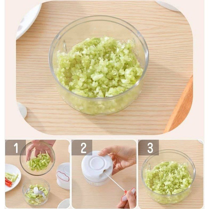 ✔ Cực dễ dàng, chỉ cần cho đồ vào, đậy nắp, kéo & thả phần dây kéo liên tục, dây kéo sẽ làm quay lưỡi cắt bên trong, xay nhuyễn đồ ăn không hề vất vả. Dùng được mọi lúc mọi nơi, ko cần điện.