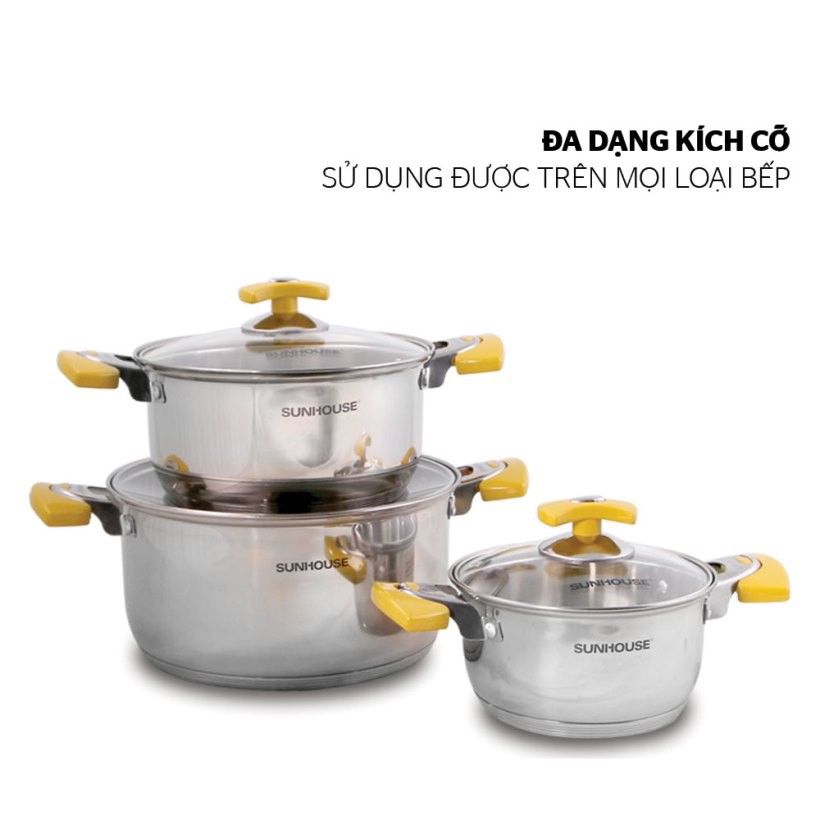 Với quai núm được chế tạo từ inox, bọc nhựa màu vàng, bộ nồi inox SUNHOUSE