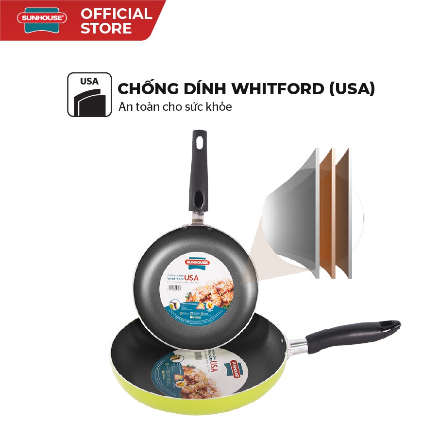 Chảo trơn màu SUNHOUSE với công nghệ chống dính Whitford - USA tuyệt đối không có tình trạng thôi nhiễm vào thức ăn, an toàn cho sức khỏe. Lòng chảo được phủ tới 3 lớp chống dính, đem tới độ bền cao, dễ dàng vệ sinh và tẩy rửa.