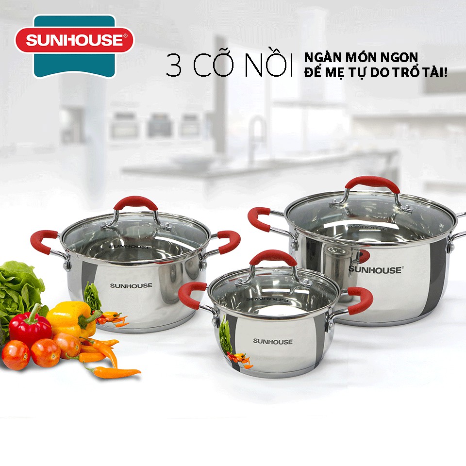 Bộ nồi inox 5 đáy SUNHOUSE SHG2503MSD sử dụng được với mọi loại bếp, kể cả bếp từ. Bộ sản phẩm gồm 3 nồi với đường kính 16cm - 20cm - 24cm phù hợp với nhu cầu nấu nướng của mọi gia đình. Nồi nhỏ 16cm thích hợp để luộc trứng, kho thịt, nồi cỡ trung 20cm để nấu canh cho 2-4 người và nồi lớn 24cm có thể luộc gà, nấu canh hoặc lẩu cho 3-5 người.