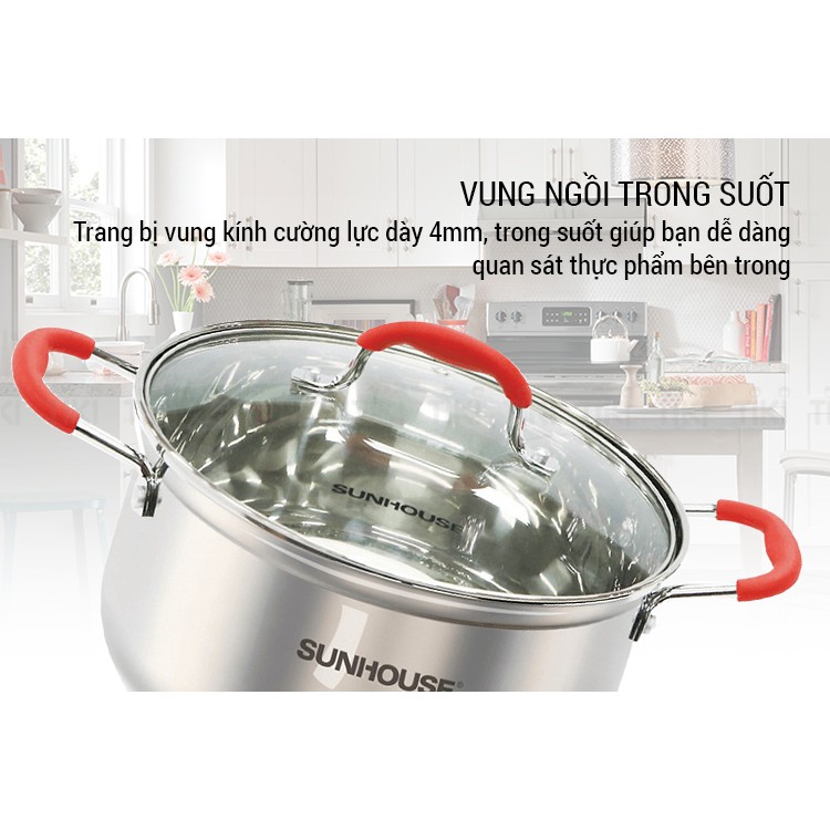 Bộ nồi inox 5 đáy SUNHOUSE SHG2503MSD được trang bị vung kính cường lực dày 3.5mm, trong suốt giúp bạn dễ dàng quan sát thực phẩm bên trong nồi. Viền mép vung được bọc inox, vừa sang trọng, vừa hạn chế bể vỡ khi va đập.