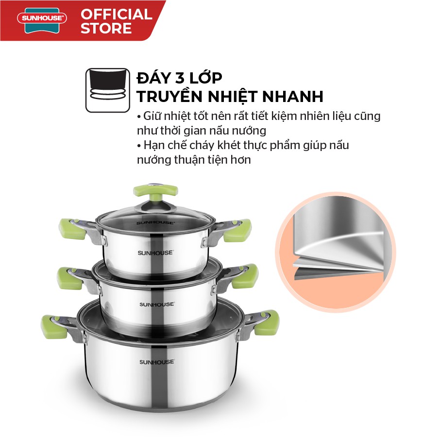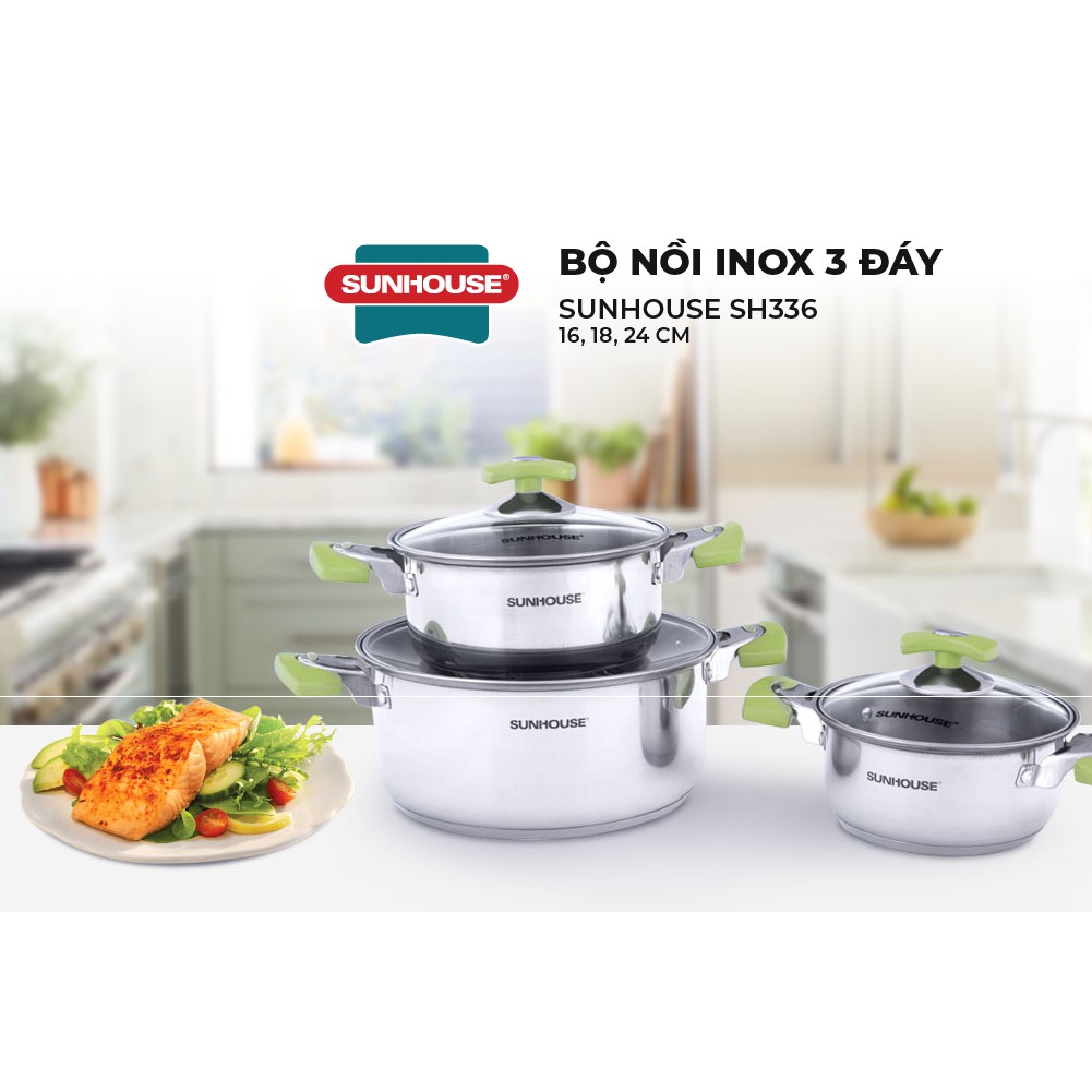 Bộ Nồi Inox 3 Đáy SUNHOUSE Đáy Từ SH336 16, 18, 24 cm💥ĐẶC ĐIỂM NỔI BẬT:
