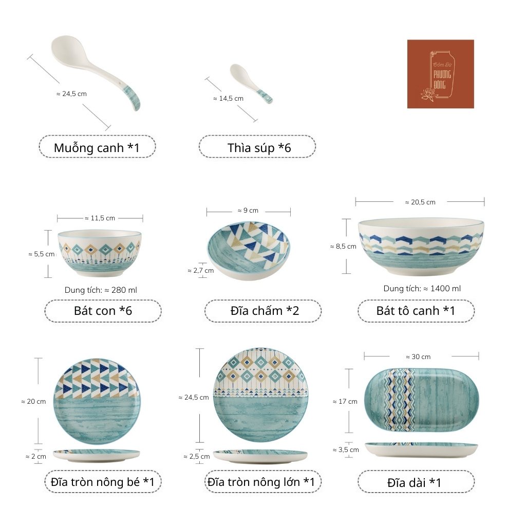 Giới thiệu Bộ chén đĩa cao cấp, bát đĩa xanh đại dương,19 chi tiết.