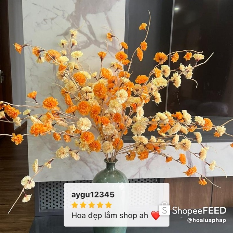 - 👉 Chất liệu: hoa làm bằng bằng lụa cao cấp, mềm mại, siêu bền, đẹp mãi với thời gian. Cành làm bằng nhựa bọc thép nên có thể uốn nắn theo sở thích.