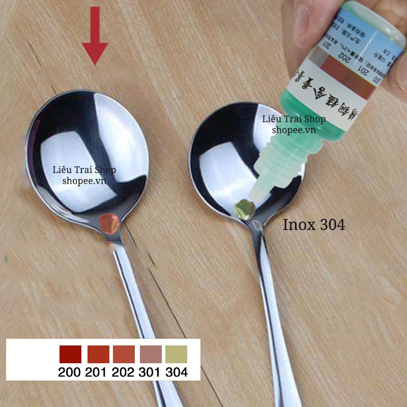 Làm sạch bề mặt inox cần thử sau đó nhỏ dung dịch thử qua quan sát sự đổi màu của giọt dụng dịch có thể biết được đó là inox 304, 201, 301 ....