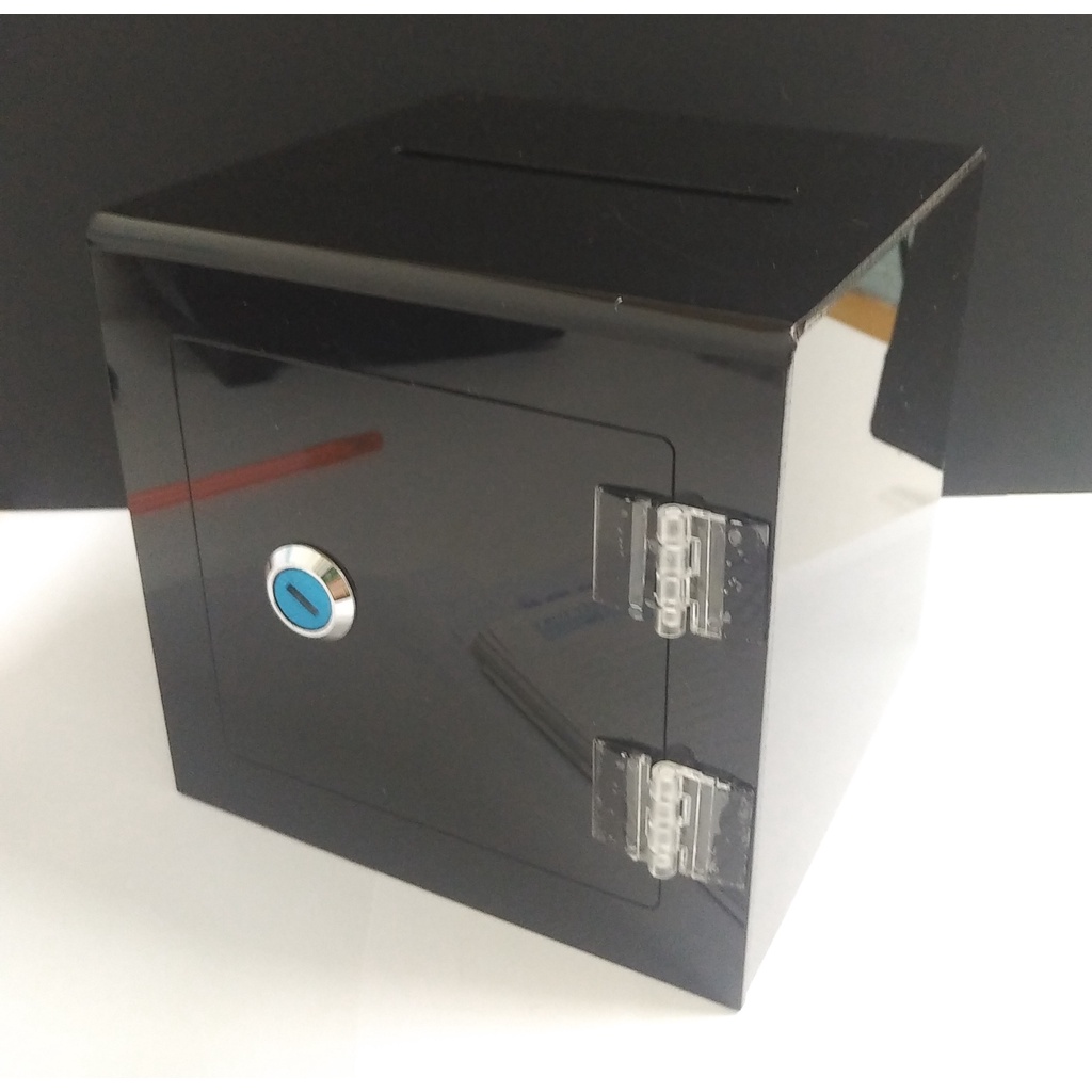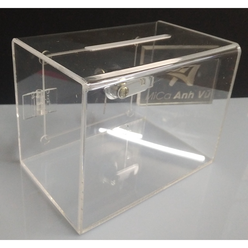Hộp làm bằng mica chất lượng cao. Mica bóng đẹp.Có khe nhét phiếu hoặc tiền trên đỉnh. Cử mở lắp sẵn khóa ở mặt sau.