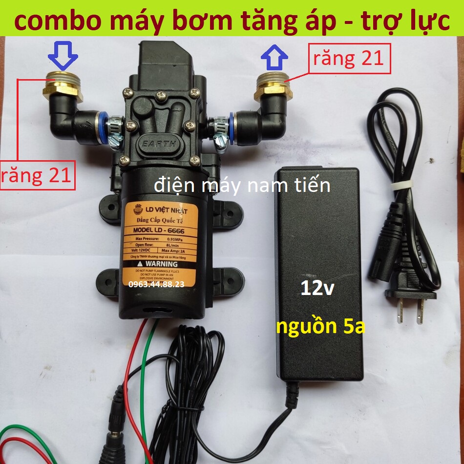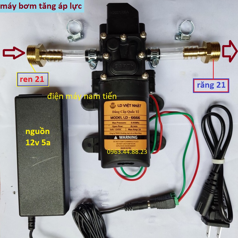 Máy bơm mini 12v + 2 đầu chuyển ren 21mm+ nguồn 12v 5a