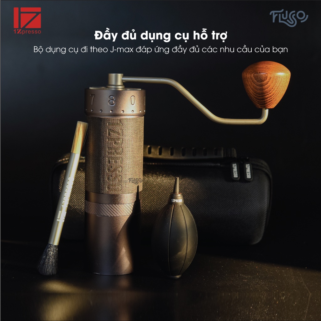 Sản phẩm chính hãng nguyên hộp bao gồm 1 Cối xay thủ công 1Zpresso J-Max, 1 bóng xịt khí và 1 chổi vệ sinh.