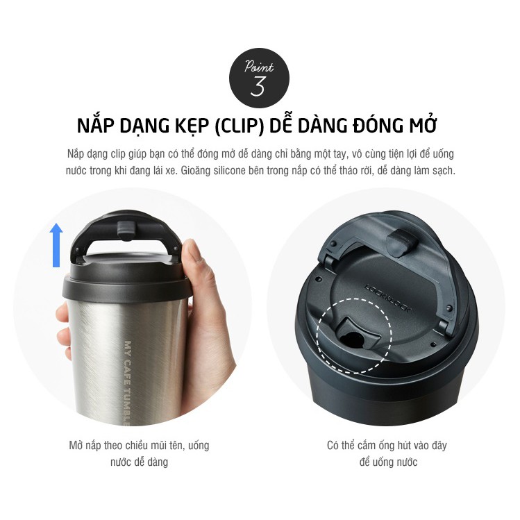 Nắp dạng clip giúp bạn có thể đóng mở dễ dàng chỉ bằng một tay, vô cùng tiện lợi để uống ước trong khi lái xe. Gioăng sillicon bên trong nắp có thể tháo rời để vệ sinh và làm sạch.