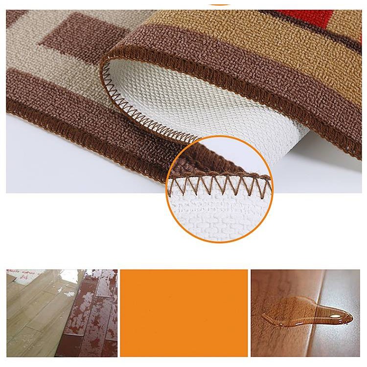 Thảm bếp lông ngắn mỏng, mặt trên là sợi tổng hợp dễ làm sạch với nhiều hoa văn hiện đại, dễ kết hợp. Mặt dưới là lớp cao su sần chống trượt an toàn.