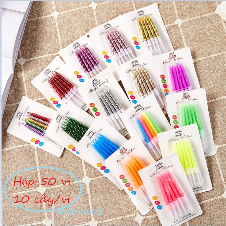 Hộp 50 vỉ nến sắc màu trang trí bánh sinh nhật, nến sinh nhậtDùng để trang trí bánh sinh nhật, trang trí bánh sinh nhật sinh nhật, bánh sinh nhật, trang trí tiệc,...màu sắc sang trọng.,