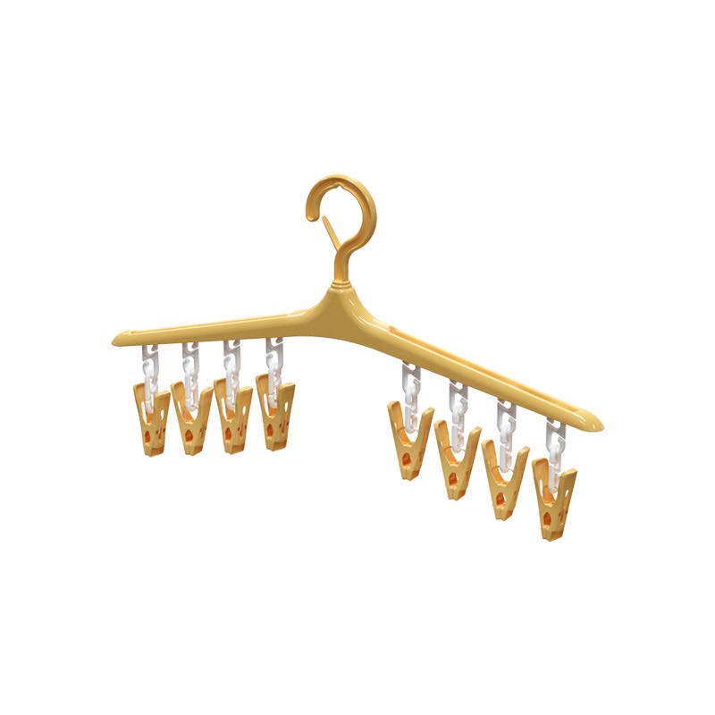 - Móc gồm 8 chiếc kẹp nhỏ dùng để phơi khăn tay, tất, găng tay, khăn len, khăn mặt... rất tiết kiệm diện tích, đầu móc có khóa giữ cố định giúp cho móc cố định tại một điểm không bị bay hoặc rớt.