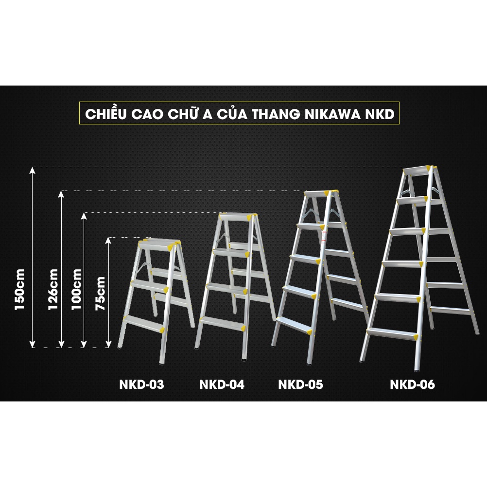 + Thang 6 bậc : Chiều cao 158cm x chiều cao sử dụng x 113cm x chiều rộng đế x 52cm x chiều rộng đáy x 148cm ( 4,5kg)