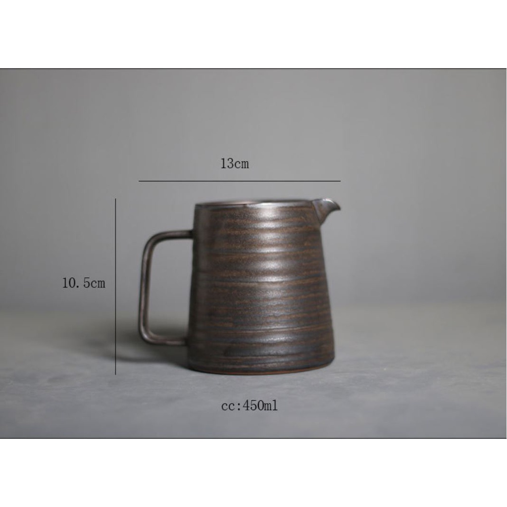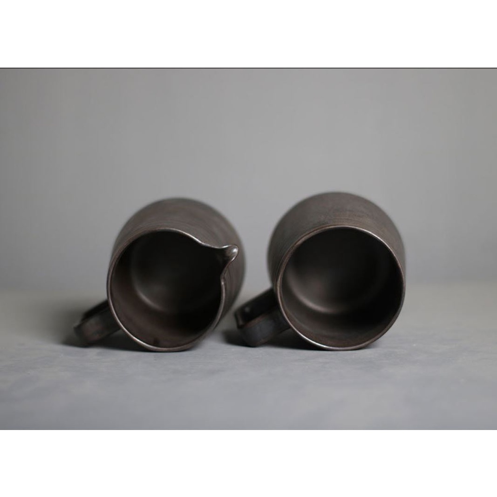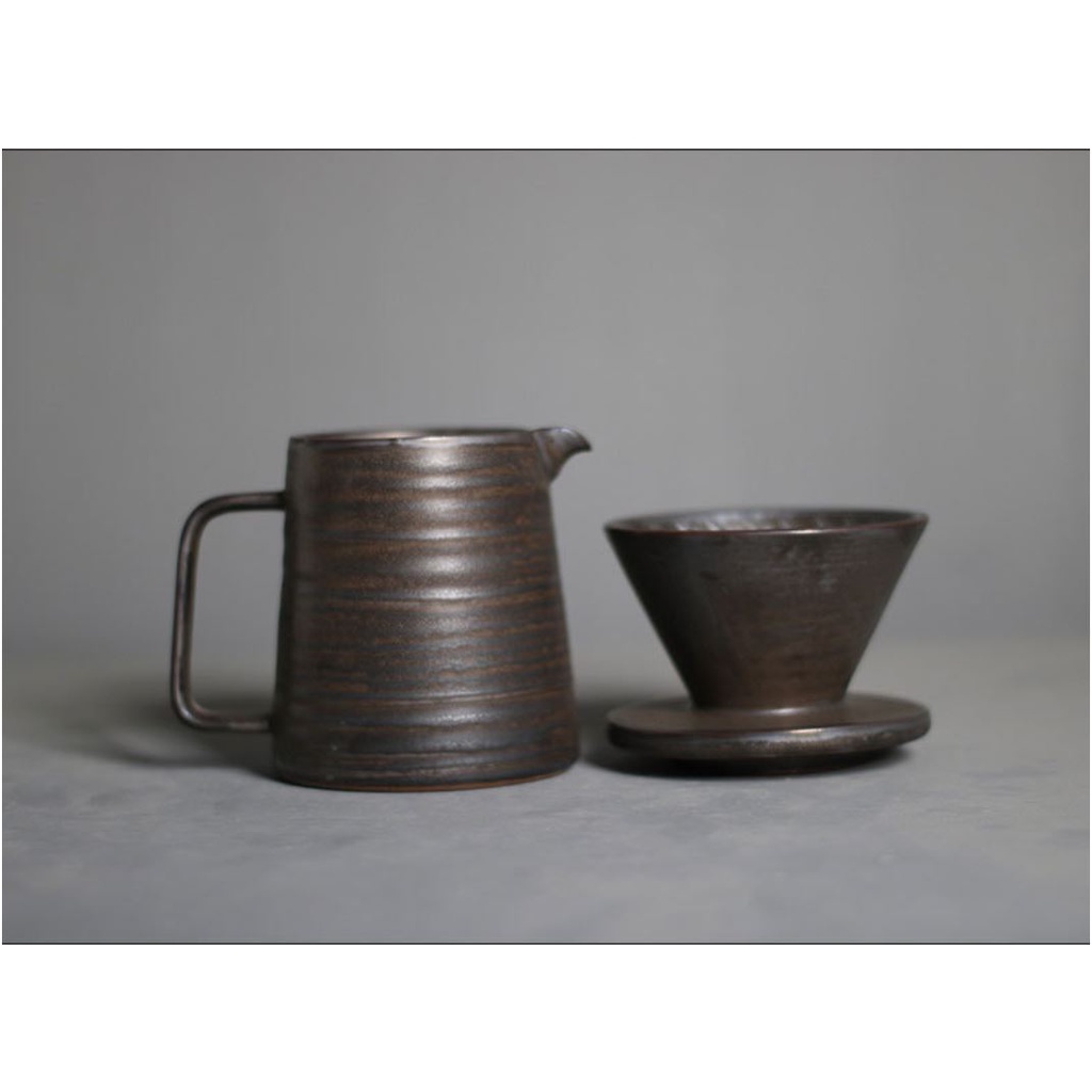 Bộ kit pha cà phê theo phương pháp pour over V60 với thiết kế phong cách cổ điển kiểu gốm Nhật men giả cổ nâu đậm.Phễu và bình đựng thiết kế đồng bộ gốm men thô dầy dặn giữ nhiệt tốt