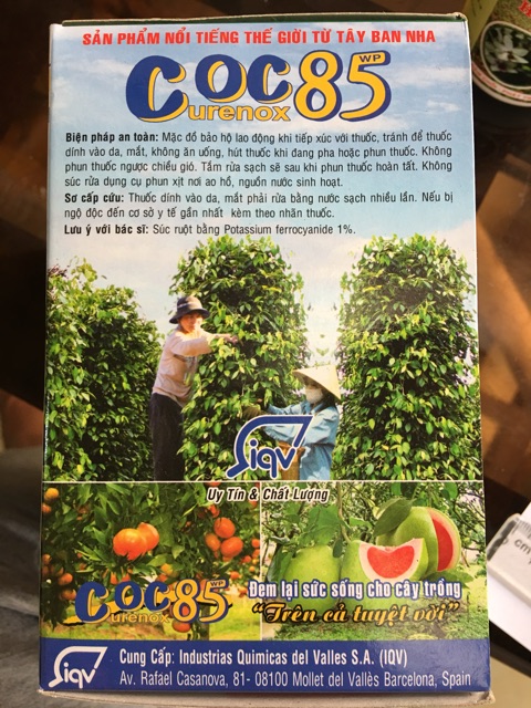 - Công dụng:Coc 85WP là thuốc phòng trị nấm bệnh, diệt vi khuẩn căn bản từ gốc đồng qua hệ thống thân, lá và rễ dùng để phòng trị các bệnh hại như: Thán thư trên cây xoài, sương mai trên cây cà chua, sẹo các loại cây có múi, cây ăn trái khác, các loại cây công nghiệp, … Ngoài phòng trị ra, Coc 85WP còn cung cấp vi lượng đồng giúp tăng năng suất và chất lượng nông sản.Coc 85WP ít độc cho ong, cá, gia súc, gia cầm, con người và không ảnh hưởng đến môi trường sinh thái.