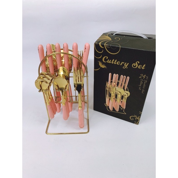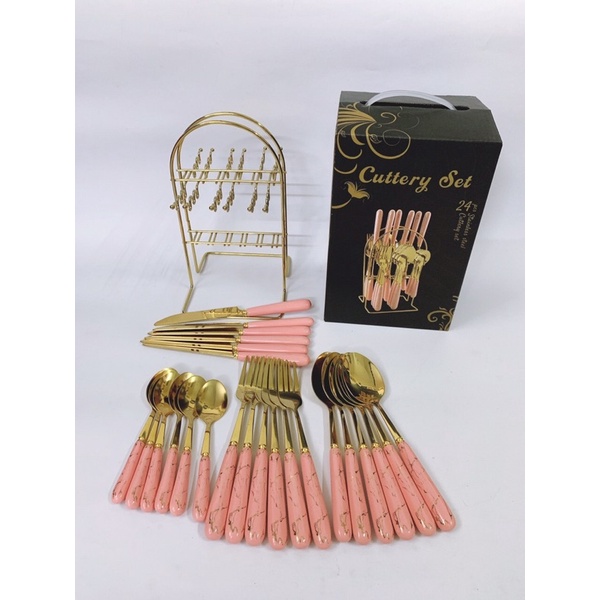 Nhà cửa & Đời sống > Bộ đồ bàn ăn > Bộ dao kéo || Bộ dao muỗng nĩa và giá đựng 24 món dao thìa dĩa cán sứ vân đá cẩm thạch HuydecorCòn hàng