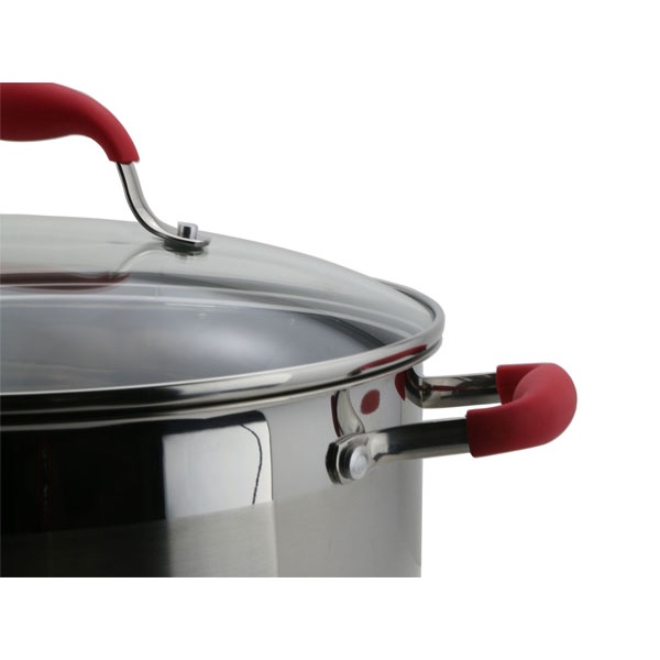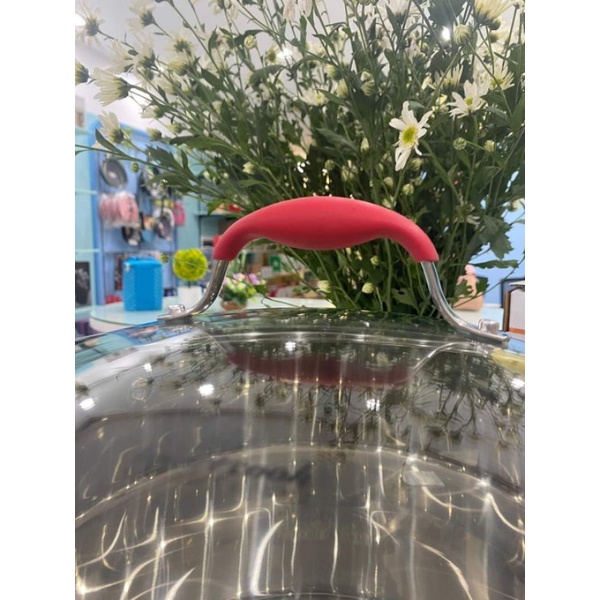 Quai và núm làm bằng inox gắn đinh tán chắc chắn có bọc nhựa bên ngoài đảm bảo an toàn, chống bỏng tay. Nắp nồi trong suốt giúp quan sát thực phẩm dễ dàng mà không cần mở vung