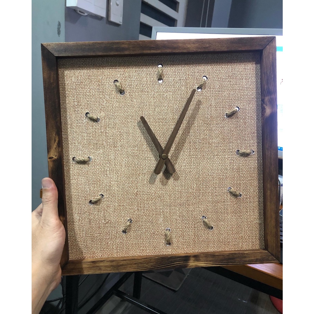 - Bề mặt đồng hồ là vải bố được cán lên tấm gỗ dày 4mm, vạch kim chỉ giờ là dây thừng.