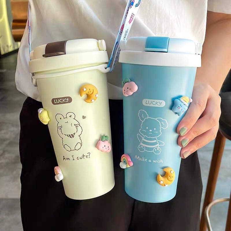Nhà cửa & Đời sống > Bộ đồ bàn ăn > Bình nước & phụ kiện || Ly giữ nhiệt 500ml, bình đựng nước giữ nhiệt cute có ống hút, dây đeo và stickerCòn hàng