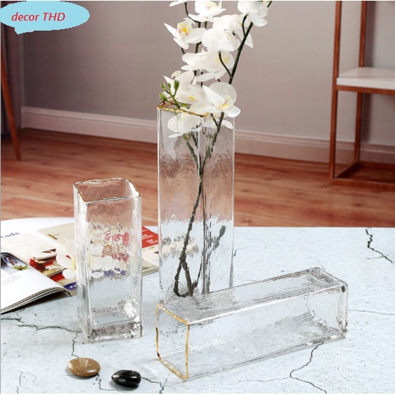 Lọ hoa bình hoa thủy tinh cao cấp hình trụ dày dặn miệng vàng phong cách sang trọng