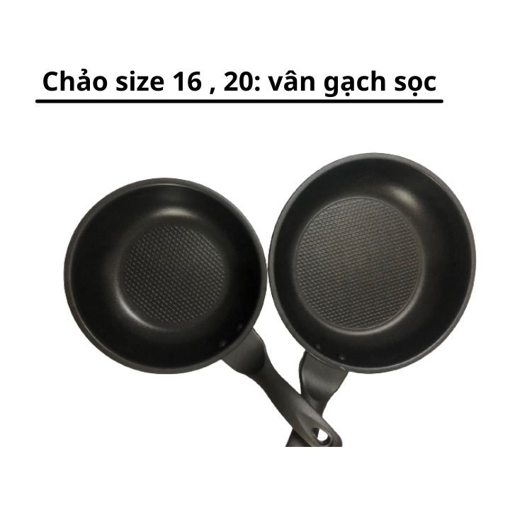 - Size chảo tính đường kính miệng chảo khách nhé, đáy chảo nhỏ hơn khoảng 4,5cm ( Ví dụ chảo 16 thì đường kính miệng chảo là 16cm, đường kính đáy chảo khoảng 11,5cm).