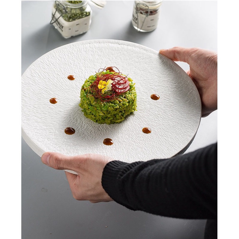 (HOT) Đĩa tròn phẳng Sarang 2 màu trắng/đen- Đĩa main nhà hàng, sứ cao cấp xuất khẩu