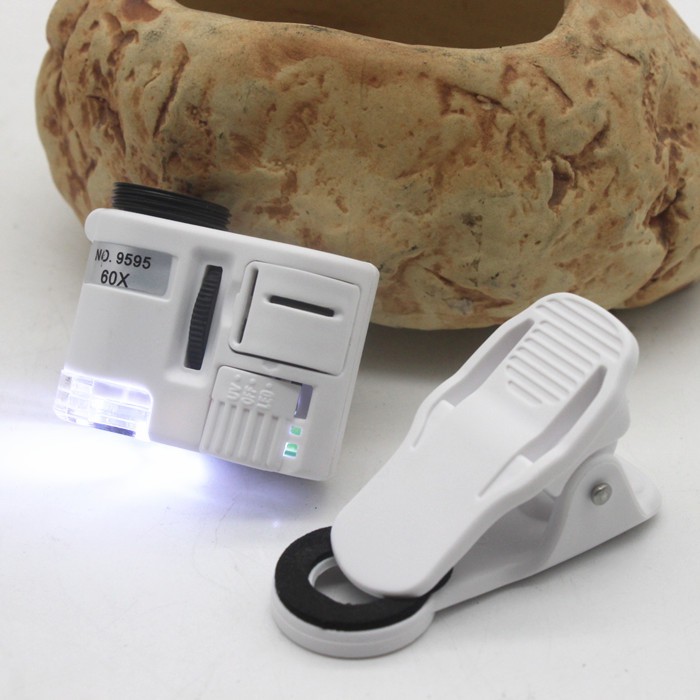Là phiên bản màu trắng kèm ngàm gắn cho mọi loại smartphone của kính lúp 9595 60X. 9595W thích hợp cho các bạn yêu thích màu trắng và có thể soi chiếu hạt trame, kết cấu vải, soi đèn UV để kiểm tra tiền giả, cà vẹt xe... hỗ trợ đèn LED trợ sáng. Có thiết kế nhỏ gọn, kèm theo dây vải tiện dụng.