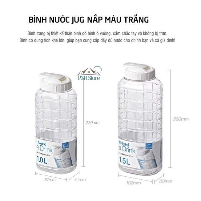 Bình nước Jug Lock&Lock 1.0L và 1.5L - Nắp màu trắng- Chất liệu: nhựa Pet