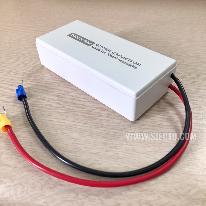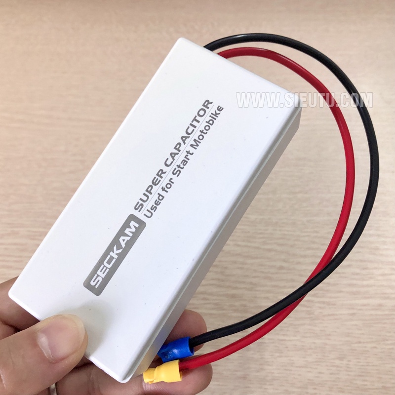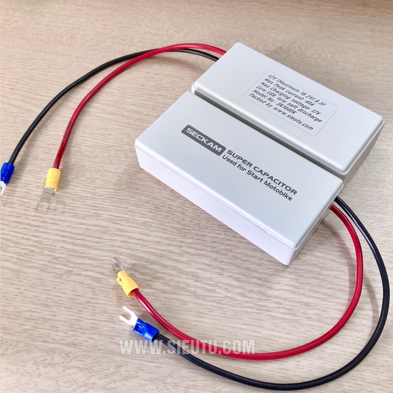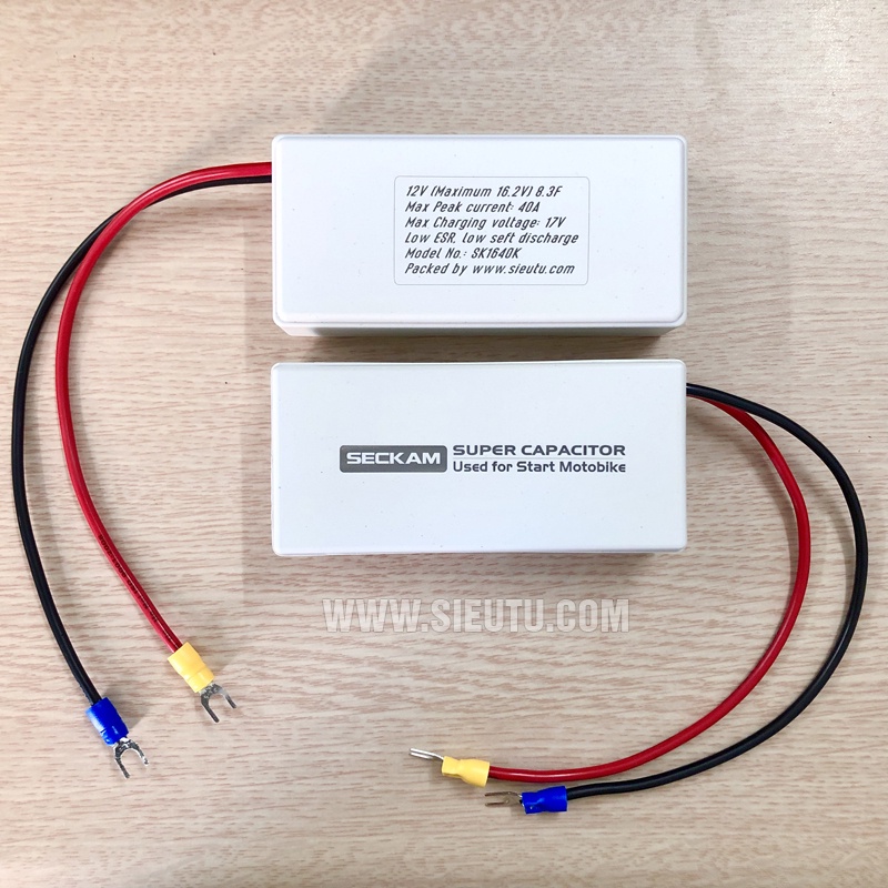 Điện áp 12V (điện áp tối đa 16V) xả tức thời 40A hỗ trợ khởi động xe máy, hỗ trợ đèn "độ" siêu sáng, hệ thống còi và thiết bị điện "độ", "mod" trên xe gắn máy. Siêu tụ điện được biết đến như một loại pin đặc biệt, có khả năng xả dòng điện lớn trong thời gian ngắn, khả năng sạc lại cực nhanh trong vòng vài chục giây, có thể xả cạn mà không ảnh hưởng đến chu kỳ tuổi thọ của siêu tụ. Với chu kỳ nạp xả lên tới 500.000 lần, siêu tụ điện vượt trội hoàn toàn các loại pin lưu trữ khác về tuổi thọ.