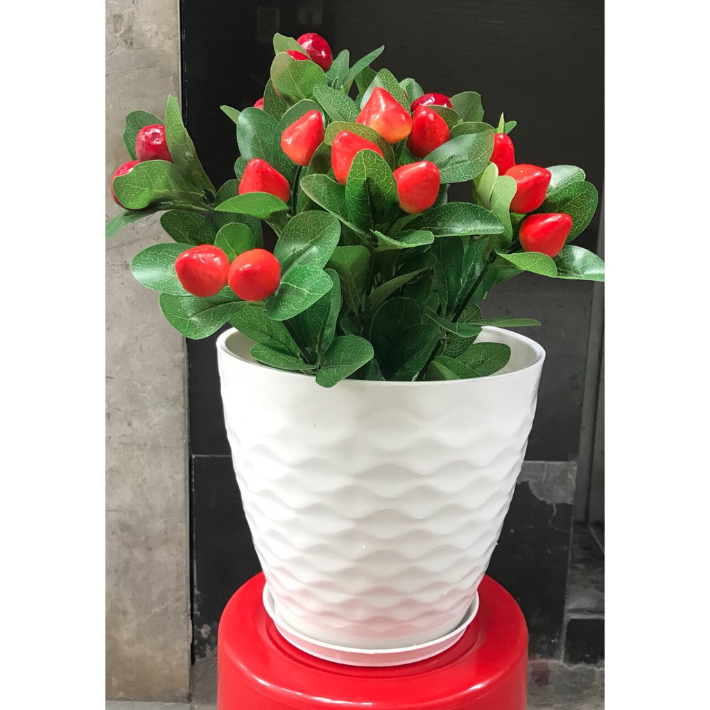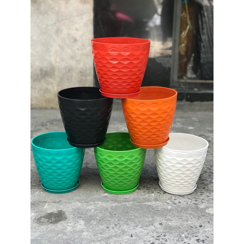 Chậu nhựa tròn, thiết kế dạng mắc lưới sang trọng.Có dĩa lót và màu sắc đa dạng