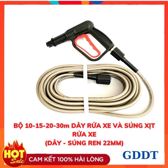 Dây máy rửa xe 10, 15, 20, 30m Kèm súng rửa xe áp lực cao ren 22mm (Súng cò đỏ)