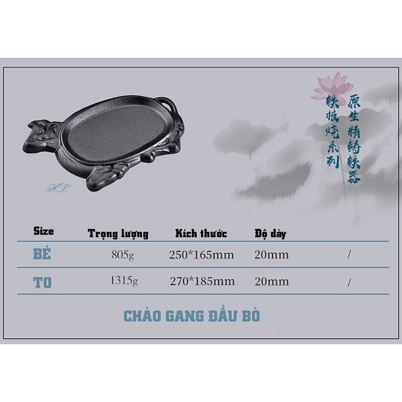Giới thiệu Chảo gang có đế gỗ Chống Dính đầu bò kèm khay gỗ ( Size Bé-Lòng 13x21cm)