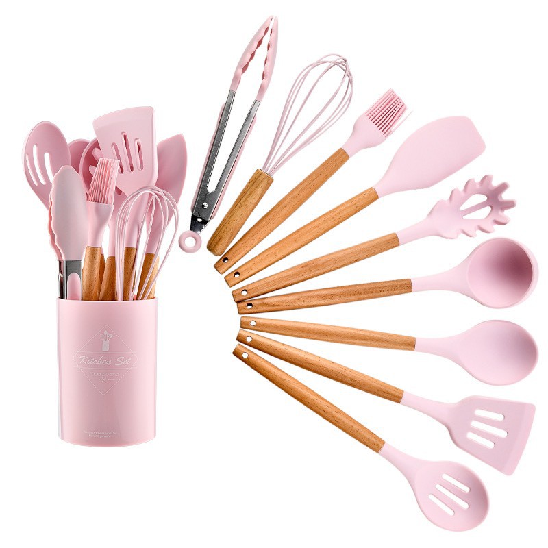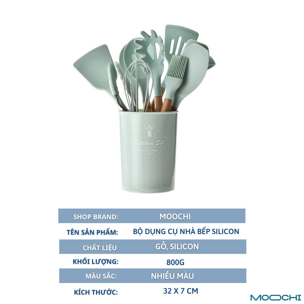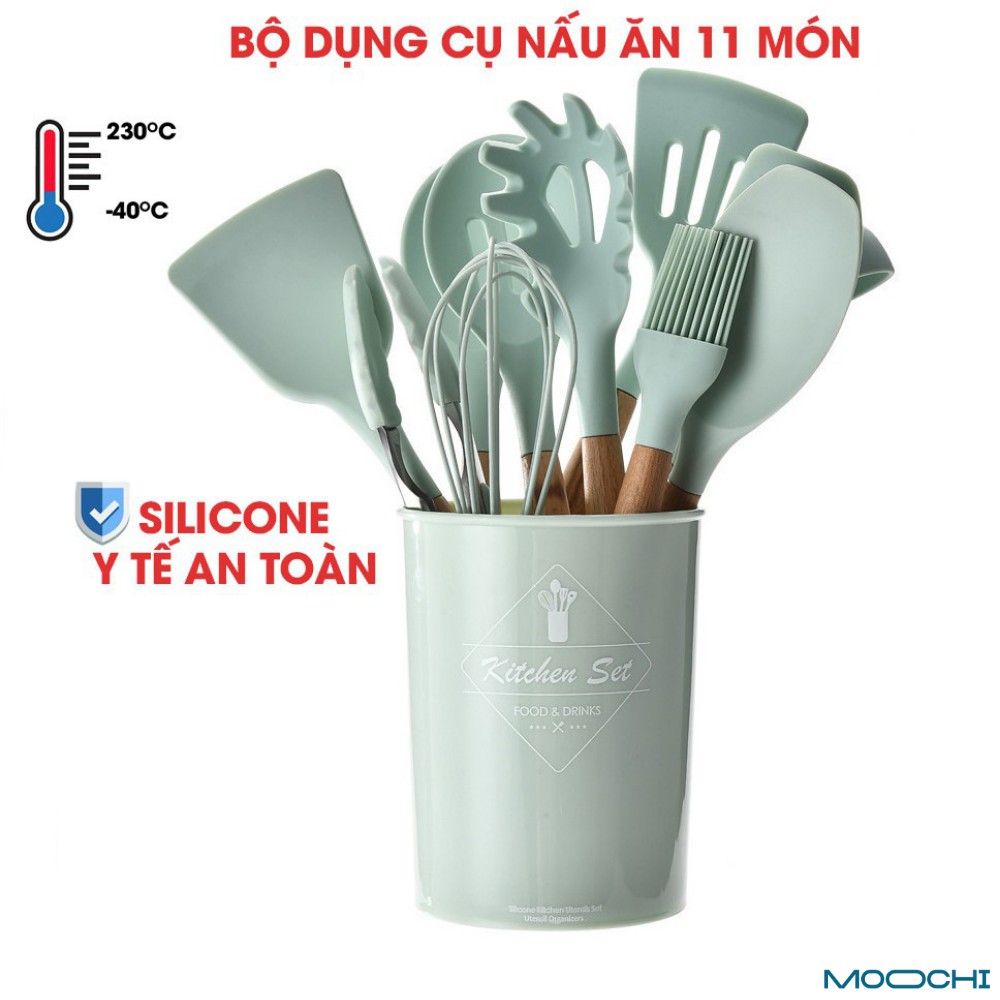 Bộ dụng cụ nấu ăn, làm bếp, làm bánh 11 món bằng silicone chống dính chịu nhiệt tay cầm gỗ tự nhiên tiện dụng cho gia đìnhThông tin sản phẩm