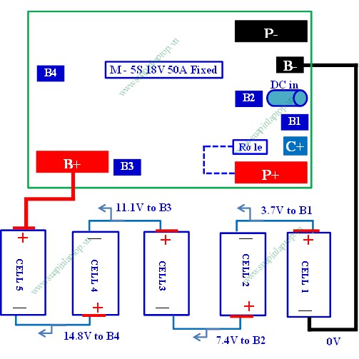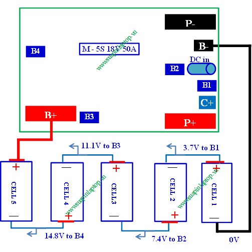 - Hàn theo thứ tự từ B- (0V), B1(3.7V), B2(7.4V), B3(11.1V), B4 (14.8V) và B+ (18V)