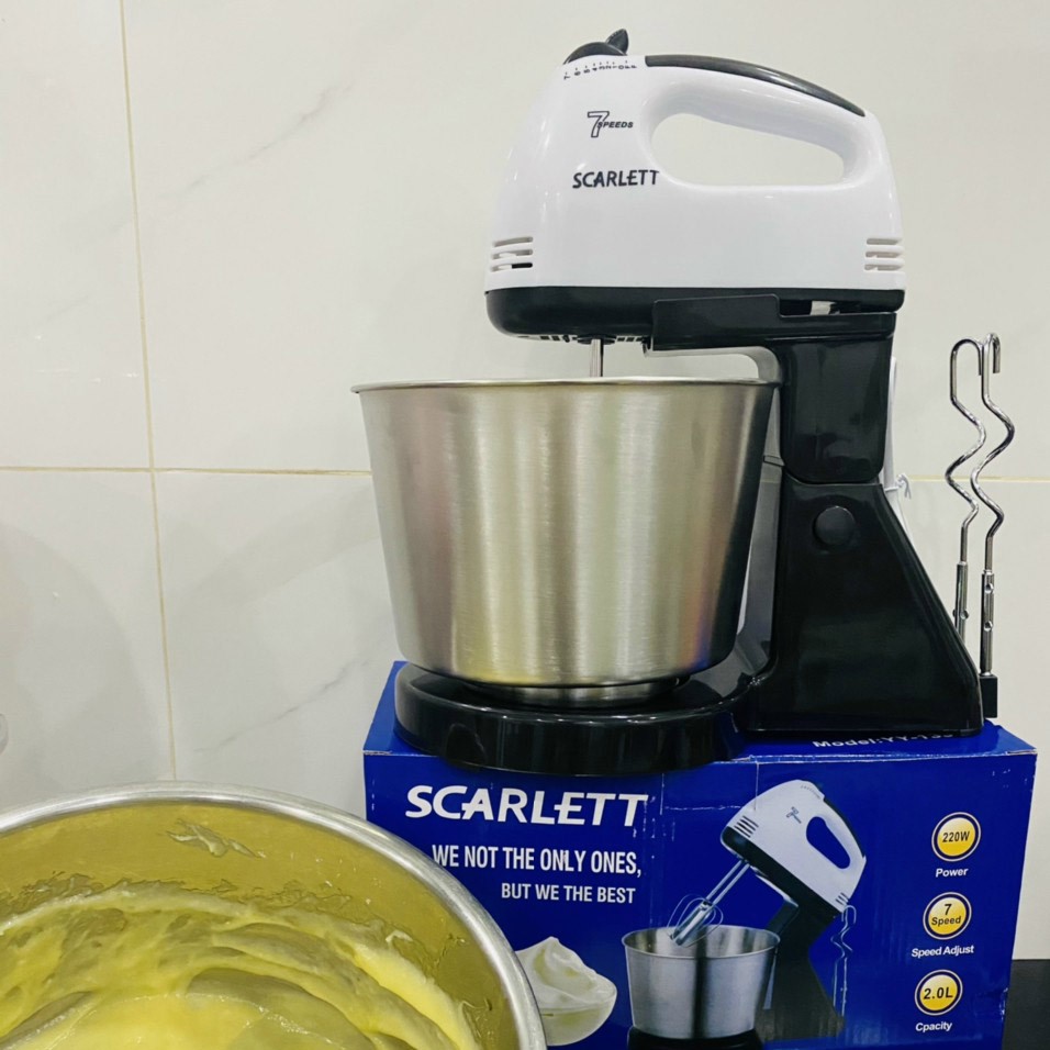 Máy Đánh Kem - Đánh Trứng Cầm Tay Scarlett có kèm Âu (thố/tô) là sản phẩm nâng cấp hữu hiệu từ dòng máy cầm tay thông thường.Máy kèm theo bộ chân đế và âu đánh. Do đó, Khách Hàng có thể dễ dàng cầm đánh như máy cầm tay thông thường hoặc gắn máy vào chân đế để máy tự động đánh.