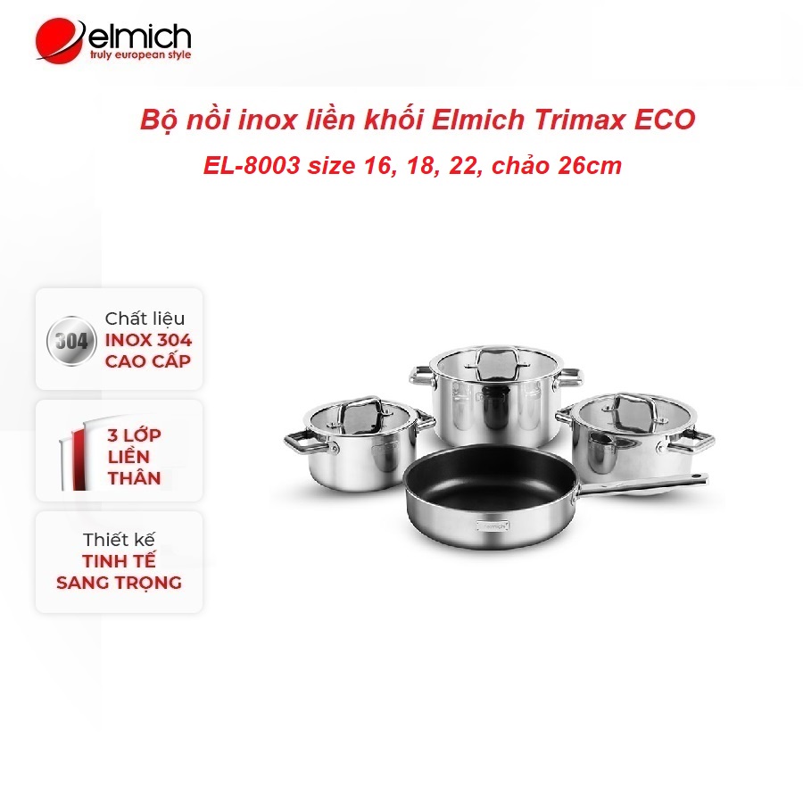 Bộ nồi inox liền khối Elmich Trimax ECO EL-8003 size 16, 18, 22, chảo 26cm