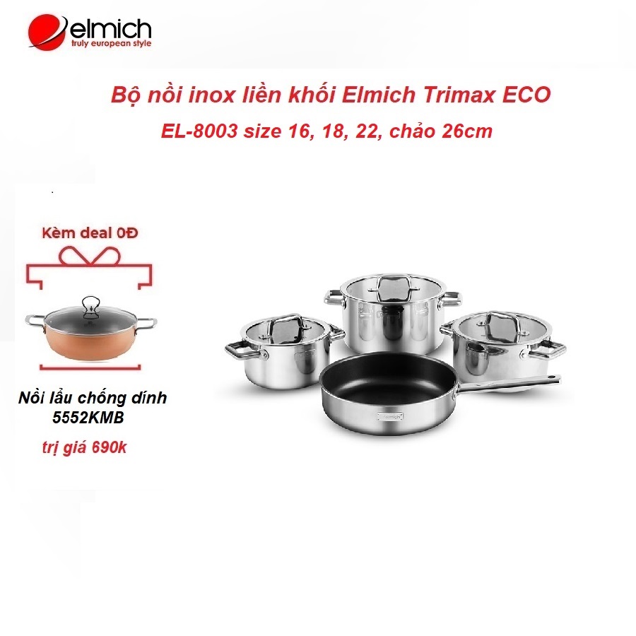 Nhà cửa & Đời sống > Dụng cụ nhà bếp > Nồi || Bộ nồi inox liền khối Elmich Trimax ECO EL-8003 size 16, 18, 22, chảo 26cmCòn hàng