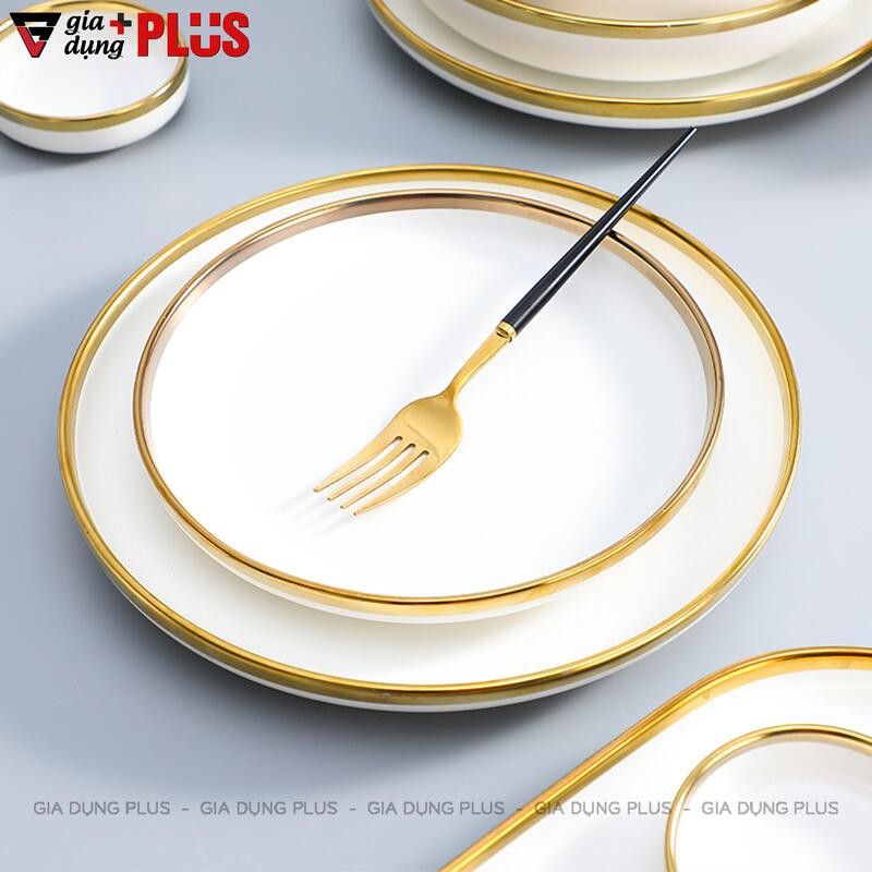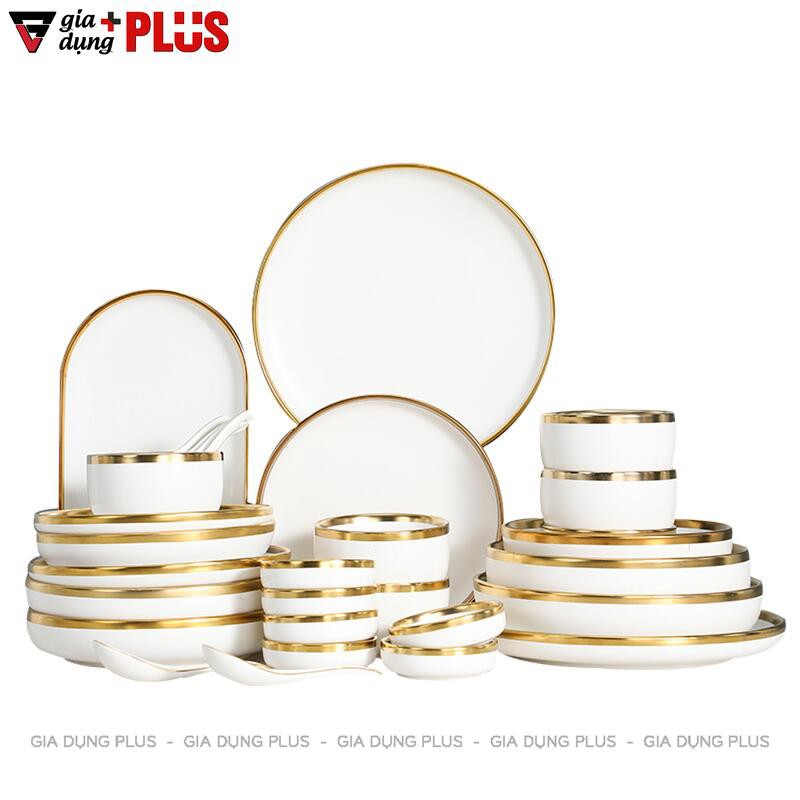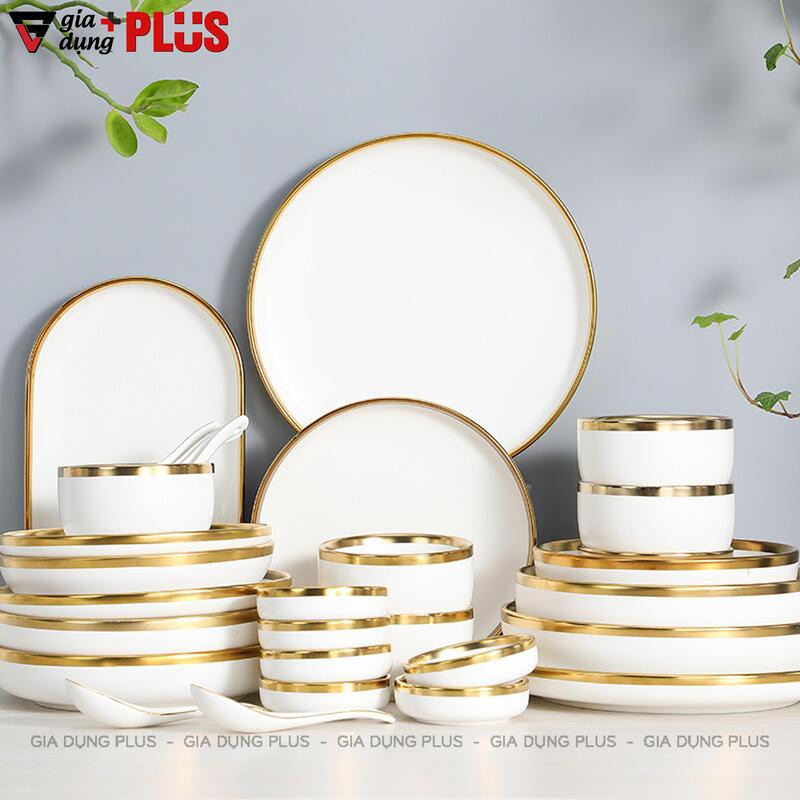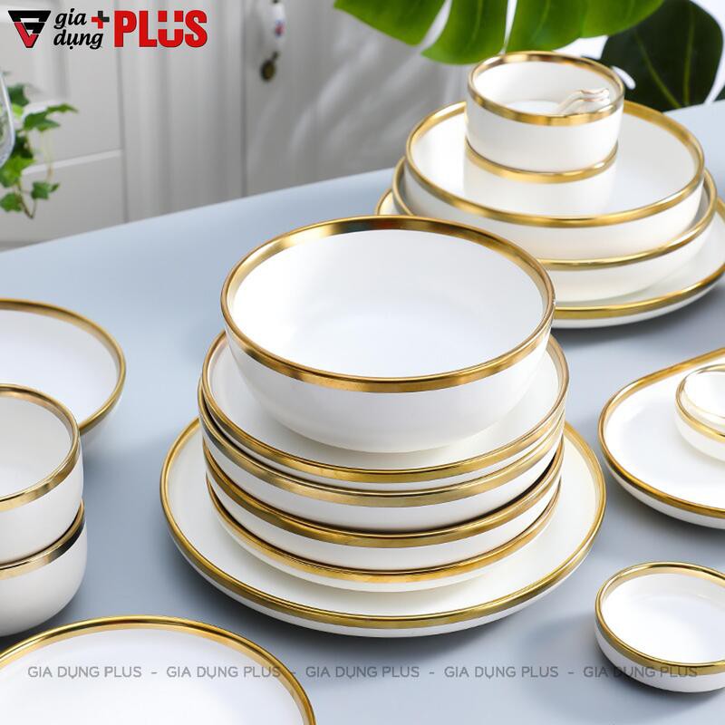 Bộ chén bát sứ trắng viền vàng cao cấp phong cách Bắc Âu - Kèm hộp quà