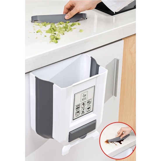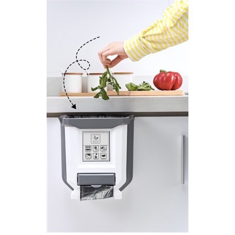 Thùng rác gấp gọn thông minh treo cánh tủ bếp kèm cuộn túi nilong đựng rác:Với thùng rác gấp gọn thông minh và treo cánh tủ bếp, chúng ta sẽ không phải chịu đựng việc mỏi lưng khi phải khom lưng nhiều lần.