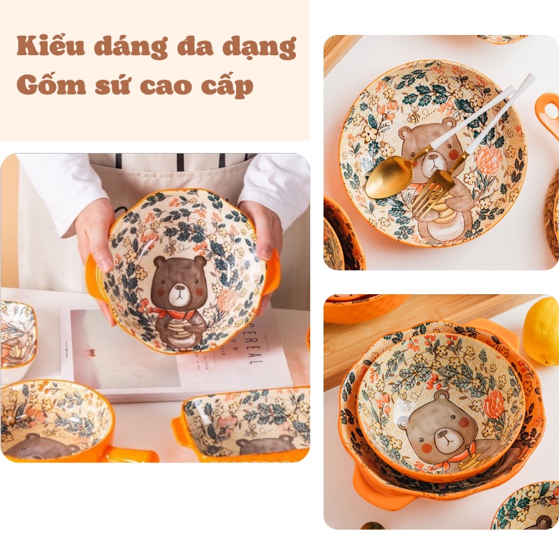 Bộ Bát Đĩa Chén Dĩa Sứ Bát Ăn Cơm Decor họa tiết Gầu Cam dễ thương