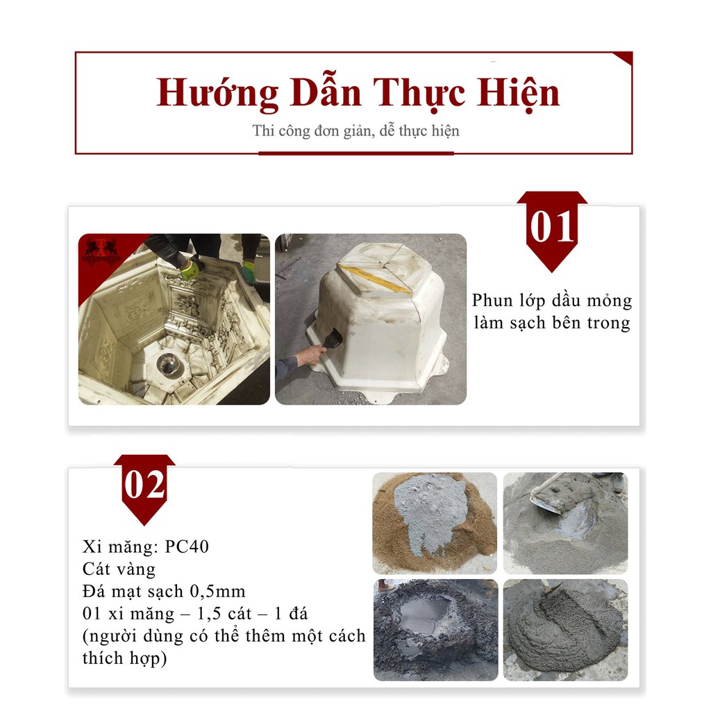 1. Chuẩn bị: 1 bộ khuôn, chổi quét, xô, bay, cát, đá dăm, xi măng, nhớt thải