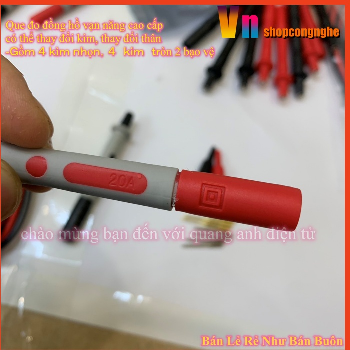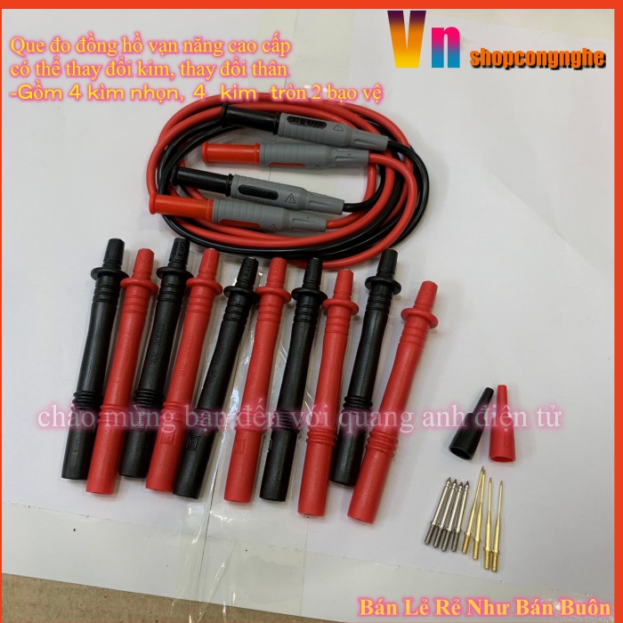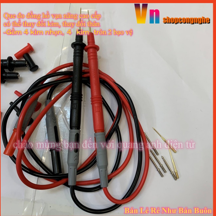 Que đo đồng hồ vạn năng cao cấp có thể thay đổi kim rất tiện ích cho các bạn kĩ thuật viên điện tử với dây đo silicon dài ,mềm dẻo chắc chắn nên các bạn có thể yên tâm về độ bền . Sản phẩm đi kèm gồm 4 đầu kim mỗi loại gồm đầu nhọn chuyên dùng để đo linh kiện dán và đầu kim bình thường chắc chắn dùng để đỏ các linh kiện cắm trên bo mạch .Thông số kĩ thuật :