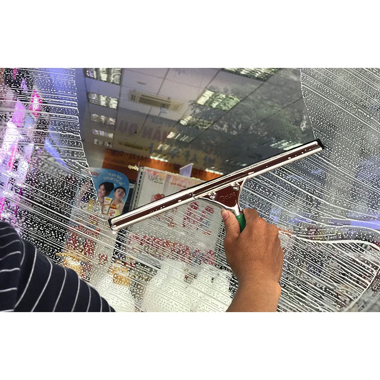 - Bước 2: Dùng tay gạt kính inox có lưỡi cao su, gạt sạch nước bẩn xuống. Khi gạt nên gạt từ mép trên tấm kính xuống mép dưới tấm kính theo phương thẳng đứng để đạt được hiệu quả cao nhất.