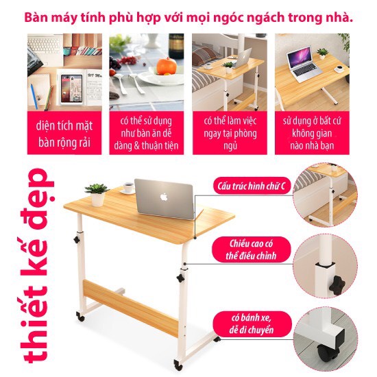 BÀN LÀM VIỆC ĐA NĂNG di chuyển linh hoạt, có thể nân lên hạ xuống. Bạn có thể ngồi làm việc tại giường, ghế sofa, ban công hay sân thượng - bất kỳ nơi đâu bạn muốn.Bàn có thể dùng để làm việc cho người lớn, bàn học cho trẻ em (thay đổi độ cao), bàn học sinh và nhiều công năng khác.