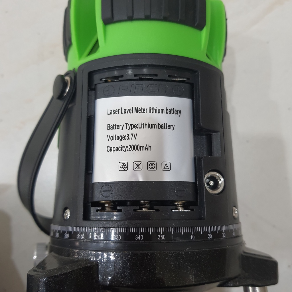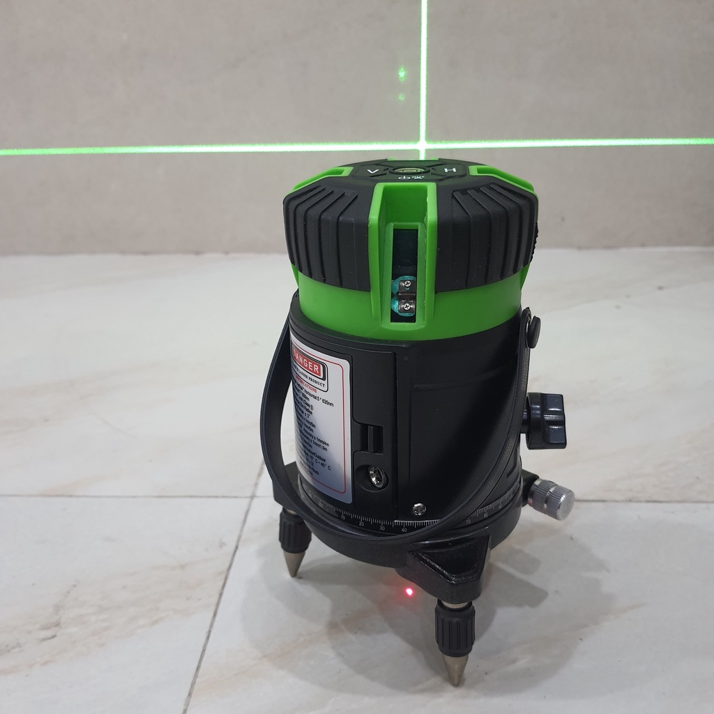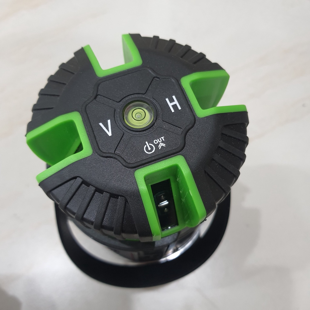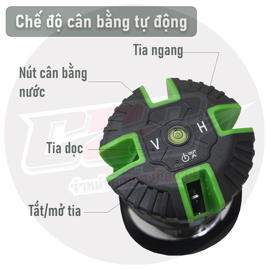 - Đầu ra tia laser màu xanh 4 tia ngang, 1 tia dọc vuông góc nhau, 1 chấm laser dọi xuống